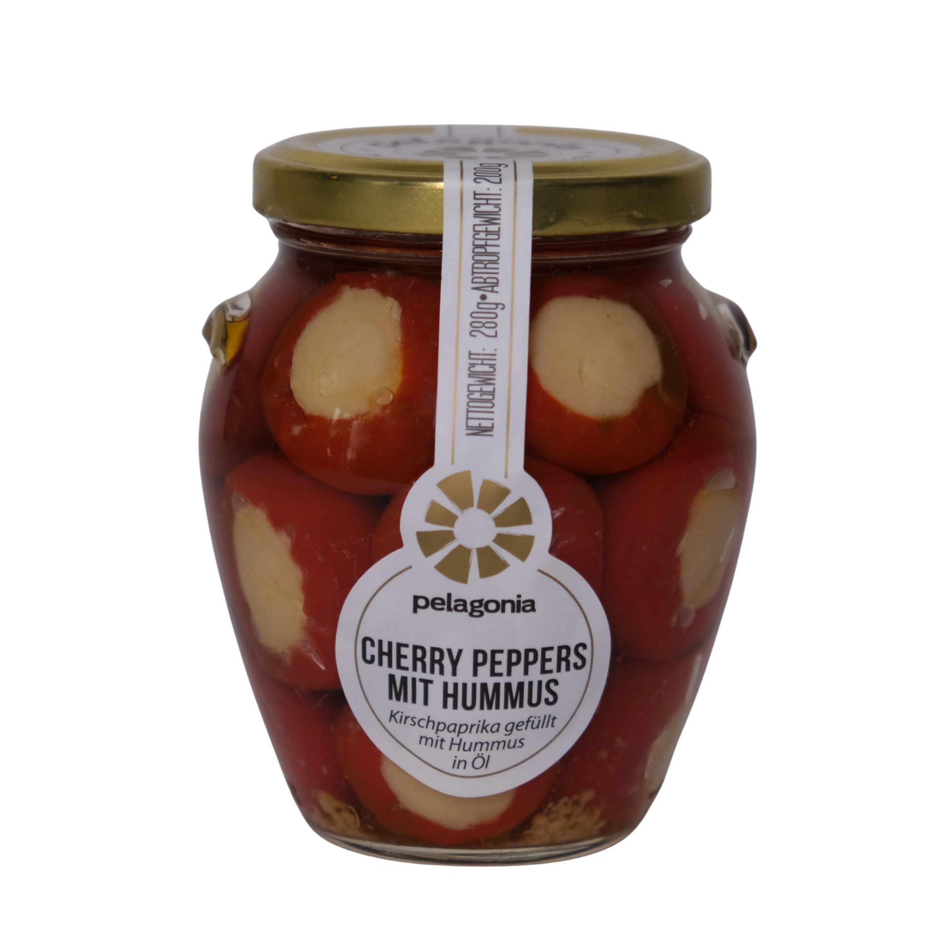 Die Pelagonia Cherry Peppers mit Hummus verbinden die milde Schärfe gefüllter Kirschpaprika mit dem samtigen Geschmack von Hummus. Ideal als Vorspeise, Snack oder Beilage – ein köstlicher Genuss mit orientalischer Note.